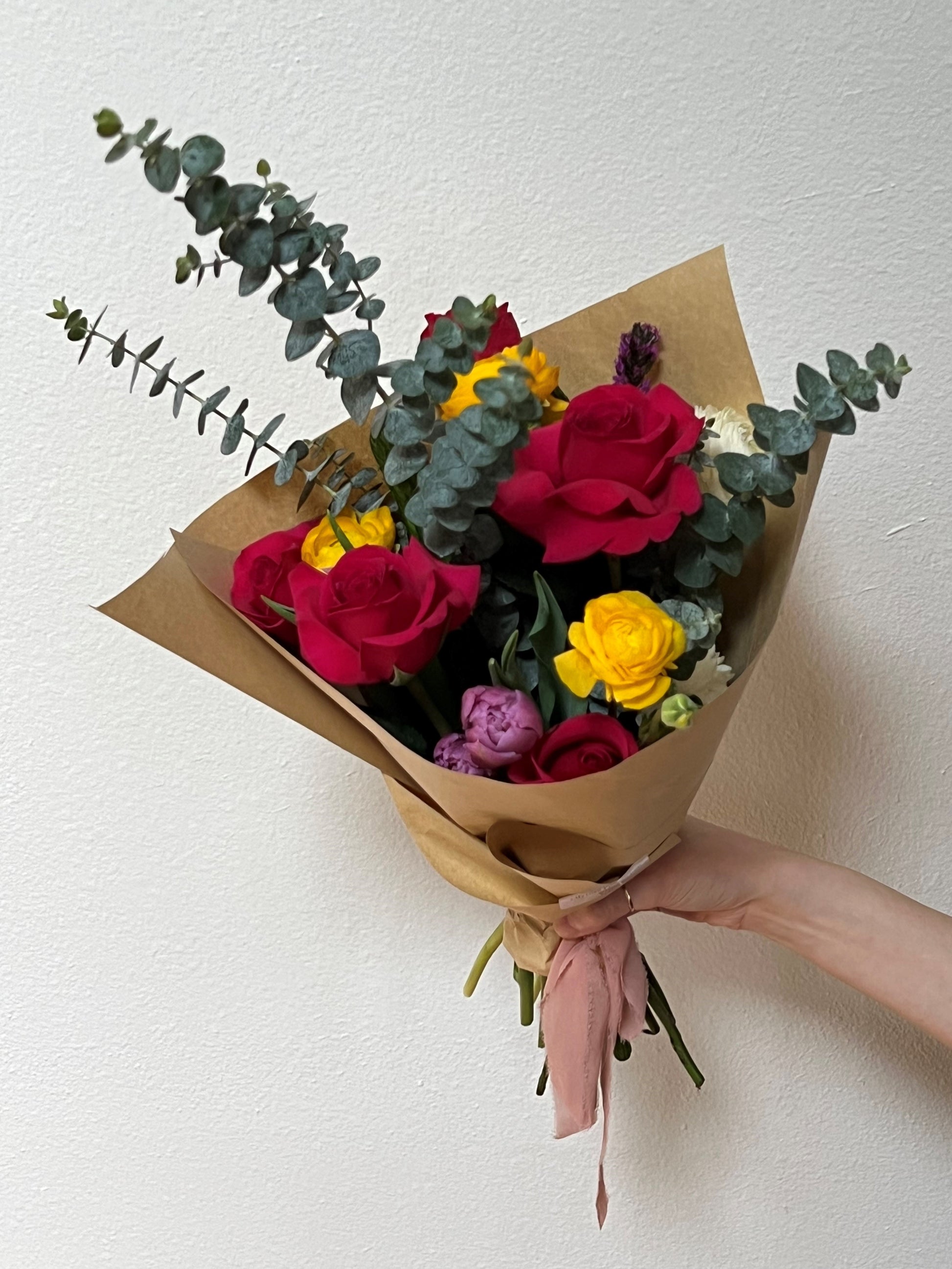 Combination of Spring fresh cut flowers. Red roses and Peonies Ranunculus