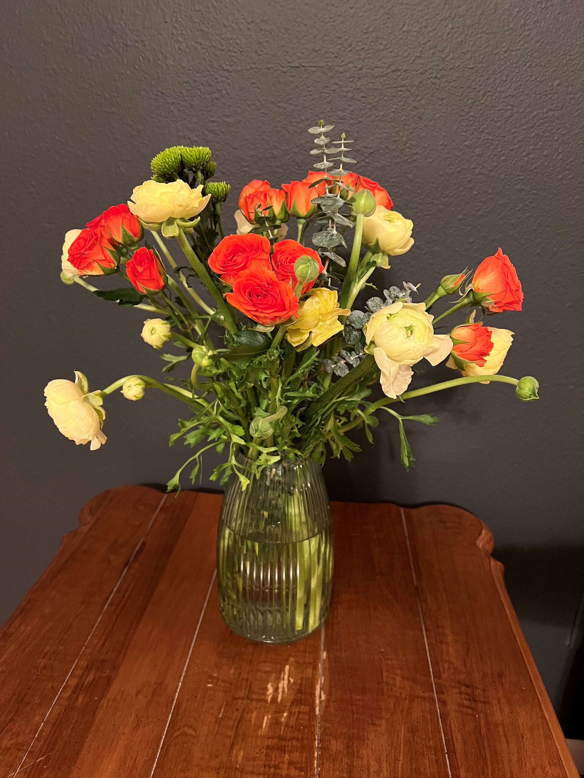 A beautiful combination of orange and yellow flowers in a unique custom vase